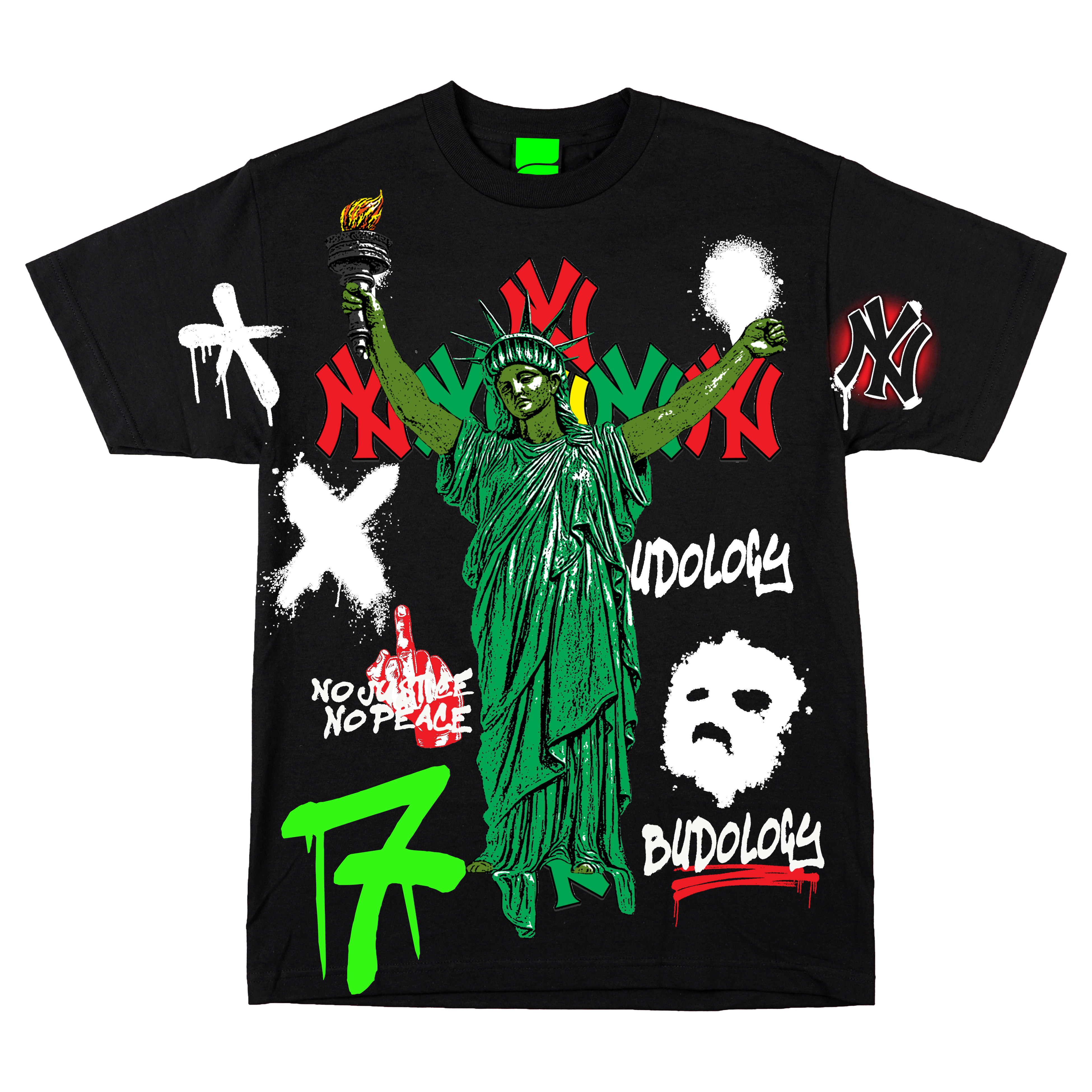 No Justice, No Peace is Budology’s love letter to New York—bold, beautiful, and never backing down. A powerful rework of the Statue of Liberty holding her torch high in protest, not pride.